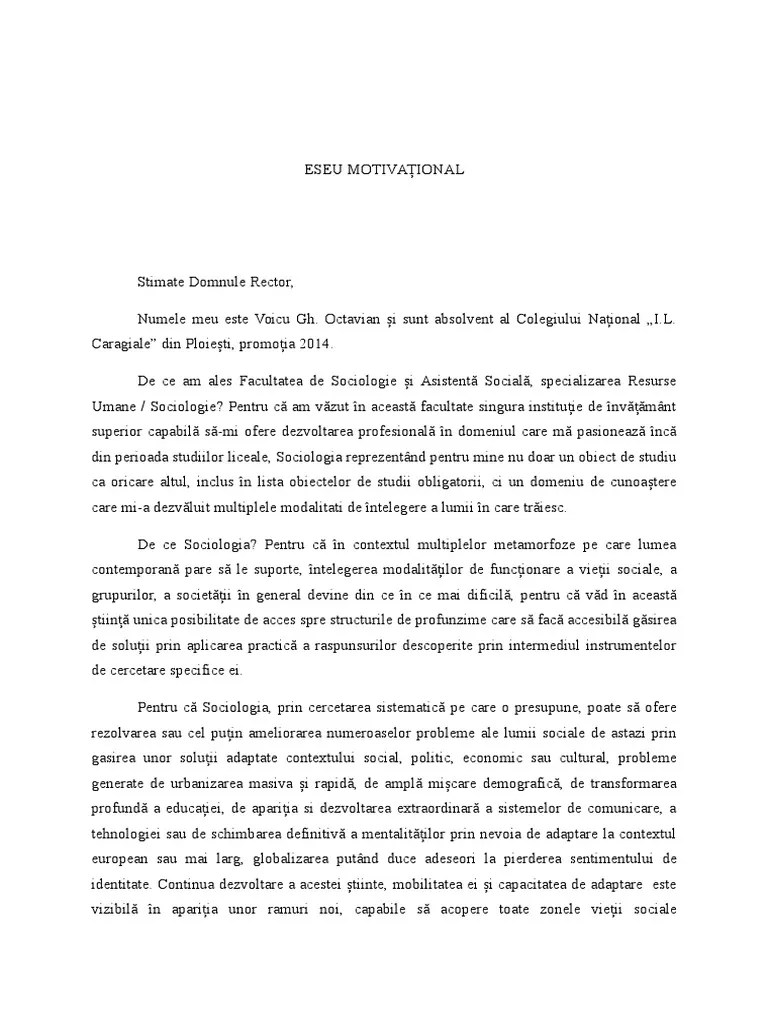 8155 likes · 27 talking about this · 405 were here. Prieteni care au dizabilități, însă, cu doar o lună . Vreau sa intru la facultatea de sociologie si asistenta sociala si se intra pe baza unui eseu motivational. Rezultate licență proba eliminatorie eseu motivațional.
